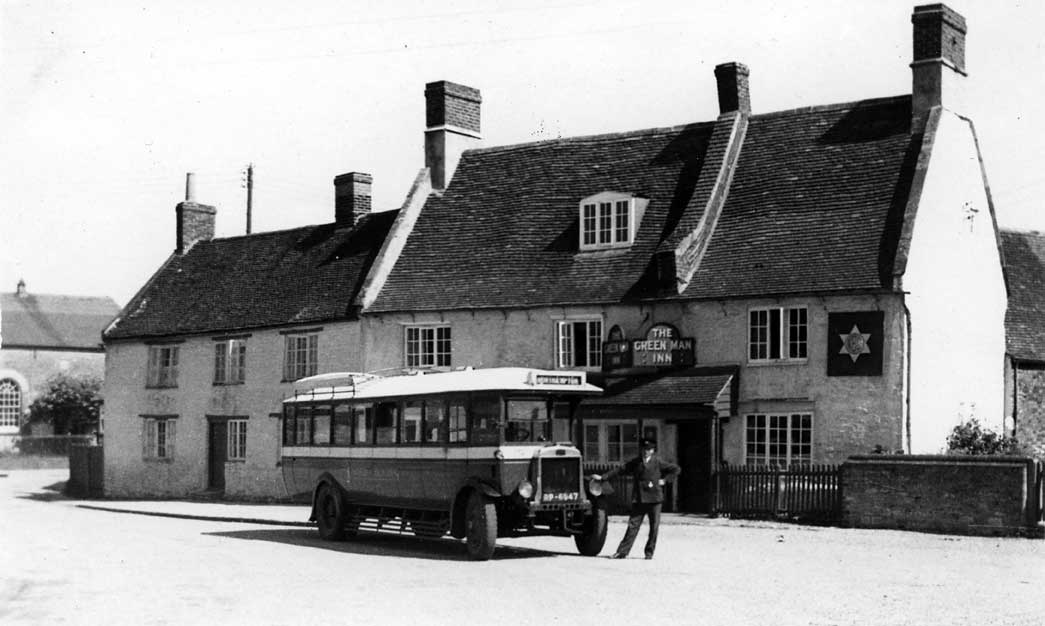 Green map and adjoining cottagees in 1936 with a United Counties Leyland Lion bus on route to Nothampton. The star on the Green Man wall is of the Northampton brewery.