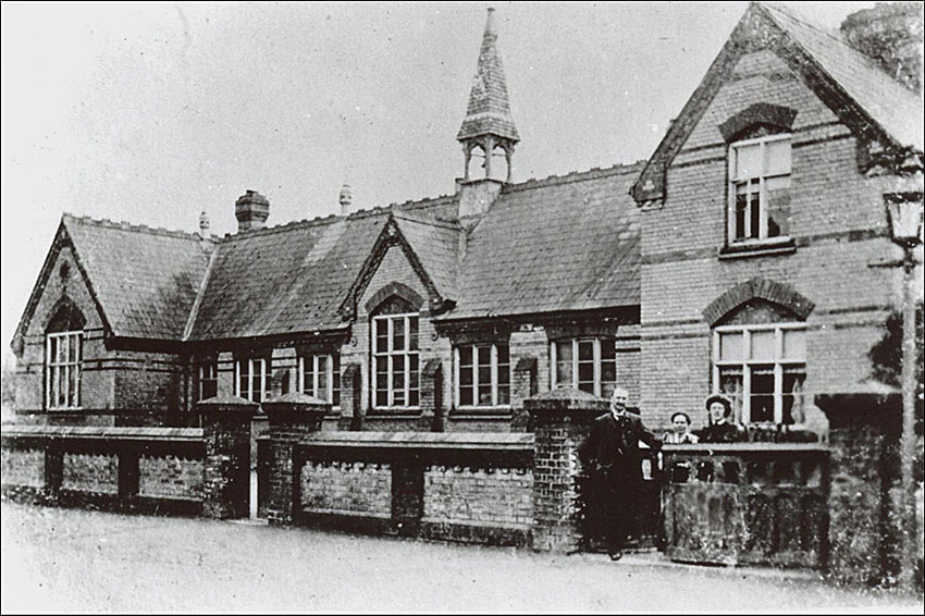 | Green End School, known as the Bottom School, in about 1910. In the photograph is the headmaster William Quixley, his wife Beatrice and their daughter. They lived in the house on the right. The school was demolished around 1968, but the brick wall is still standing in front of the present school. | |||||