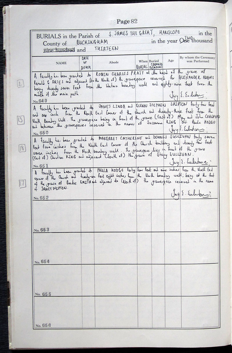 Comments in register: A faculty has been granted to Janet Linda and Glenn Stephan Shipton forty four feet and one inch from the north east corner of the church and twenty three feet from the north boundary wall. The gravespace being in front of the grave (east of) May and John Crawford and between the gravespaces reserved in the names of Suzanne King and Paula Hodge. |