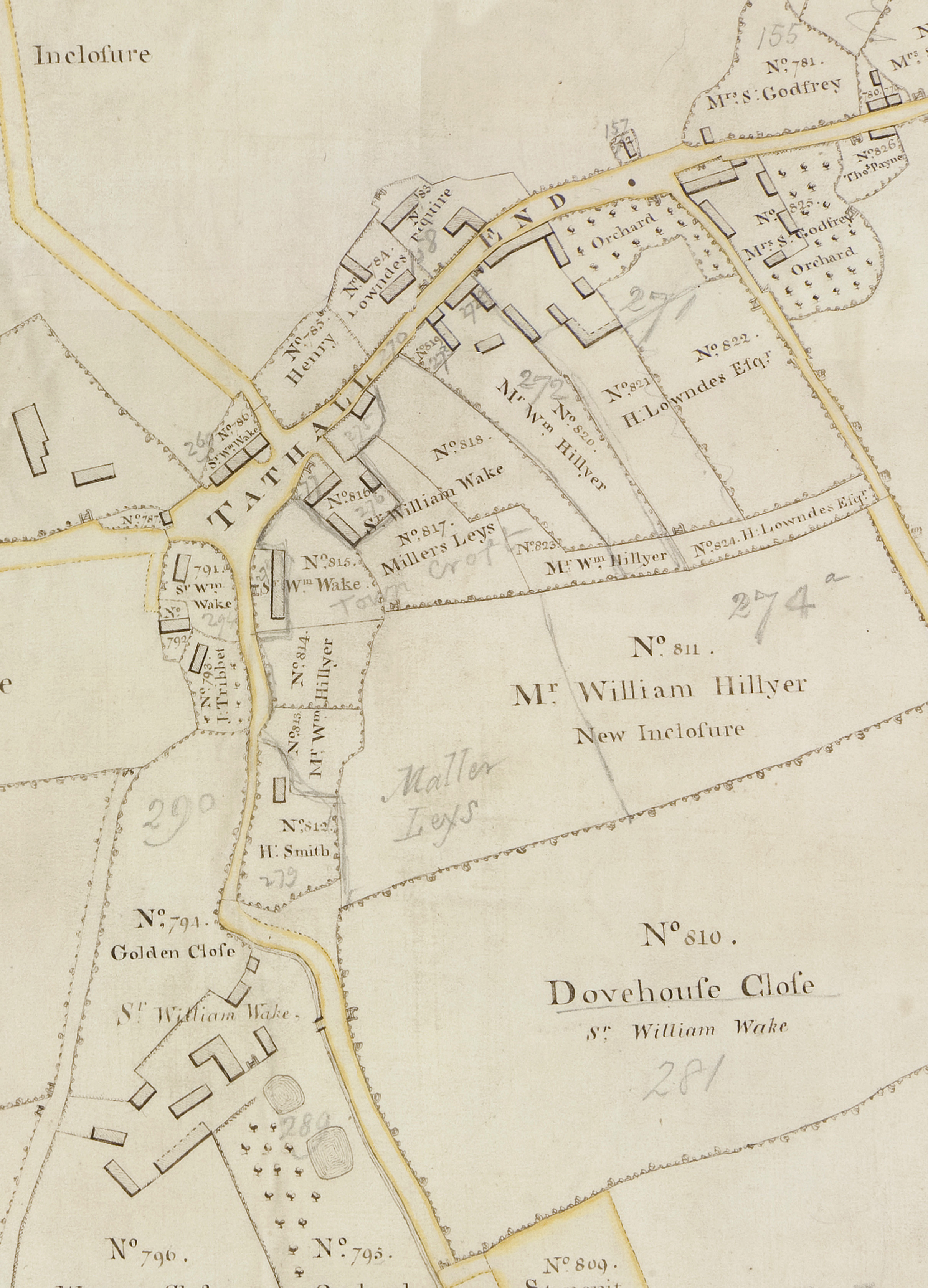 | The map shows Tathall End in 1779. The land shown as in the ownership of Sir William Wake is believed to be the land that once constituted the Manor of Tothall, a subordinate manor to Hanslope Manor created before 1276. At the end of the 13th Century the land was held by Tothall family. The land was purchased by Edward Watts in 1802. | |||